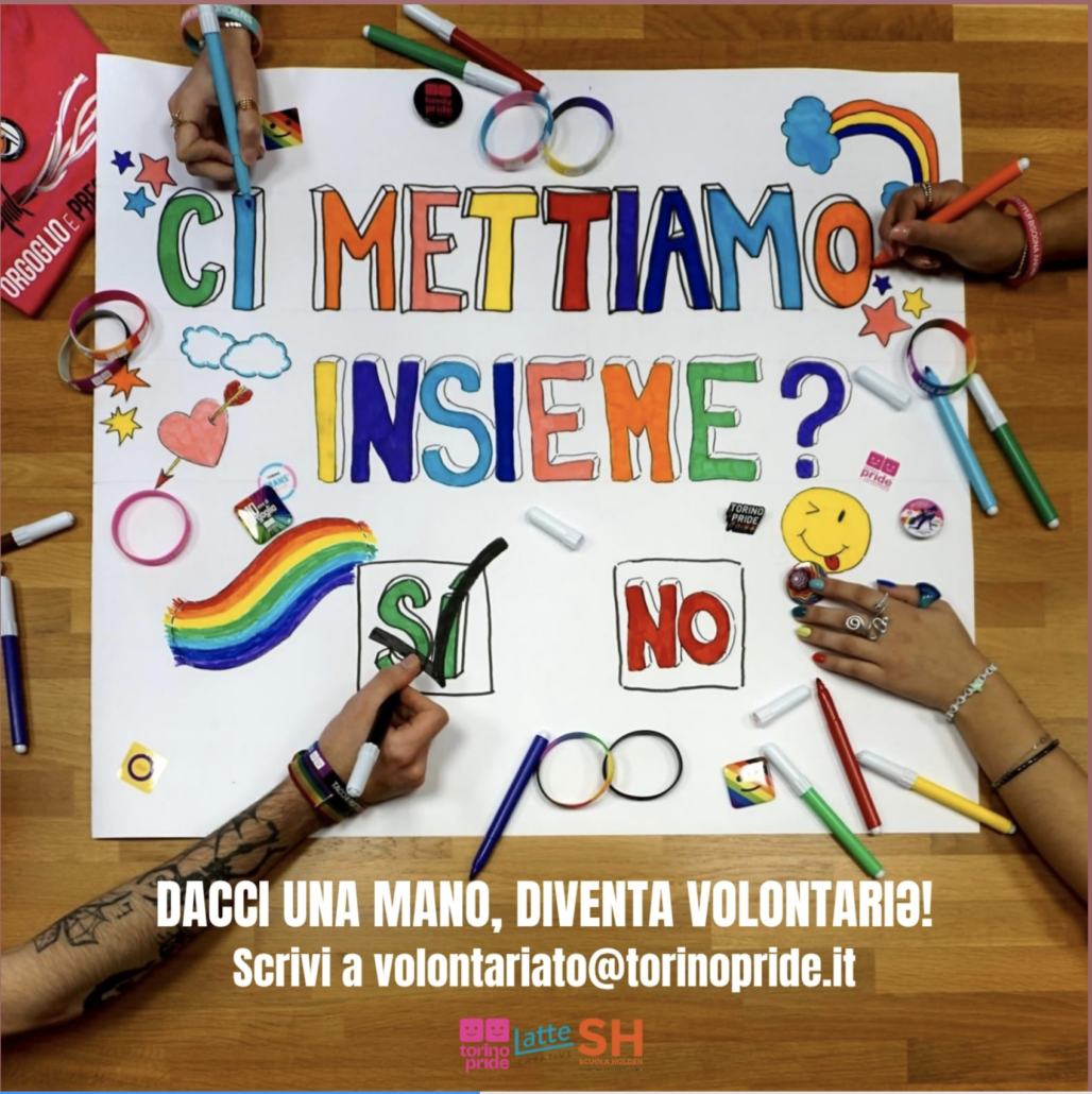 👉 Entra nella squadra di volontariə del Torino Pride! Basta compilare il modulo qui sotto con le tue informazioni e ti contatteremo al più presto con tutti i dettagli.