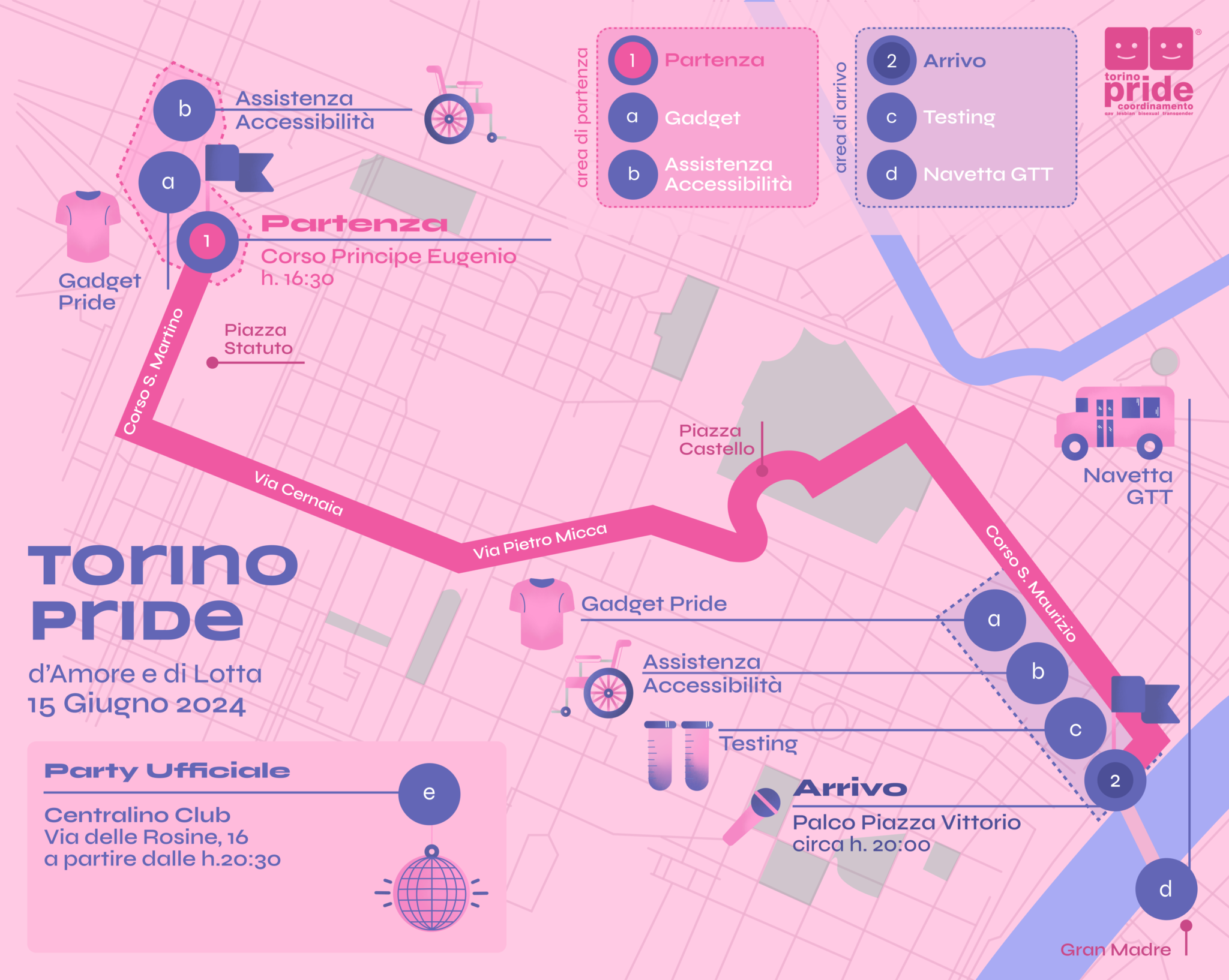 Anche quest’anno, nella zona di arrivo della parata, sarà presente l’area dedicata al test rapido per HIV e Sifilide, con personale sanitario specializzato, in collaborazione con Torino Fast Track City. Verranno anche distribuiti materiali informativi e profilattici per promuovere l’accesso sicuro e senza stigmi alla sessualità in tutte le sue forme.